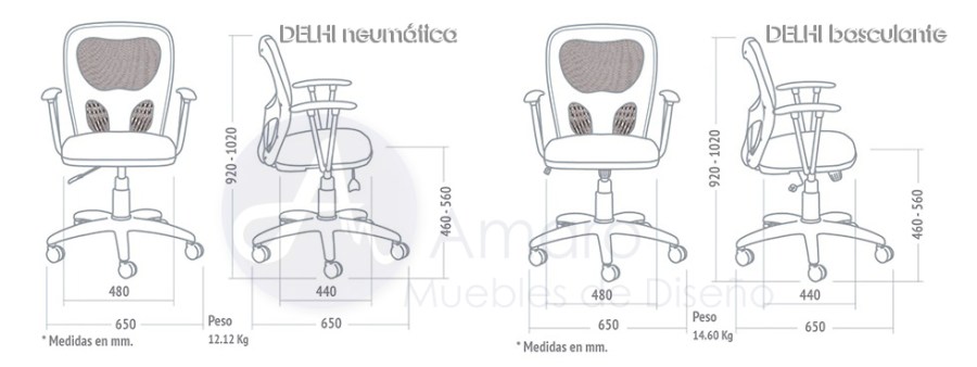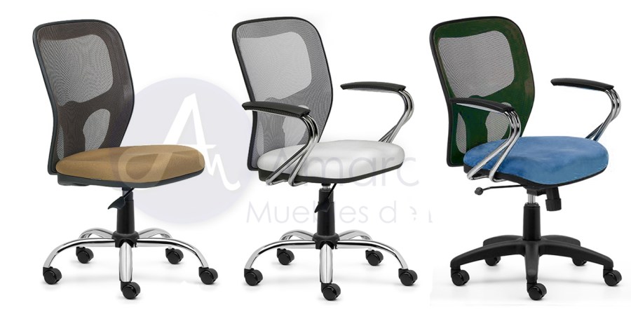 Silla modelo DELHI, asiento tapizado en tela o eco cuero de alta durabilidad y respaldo en red para mayor comodidad.